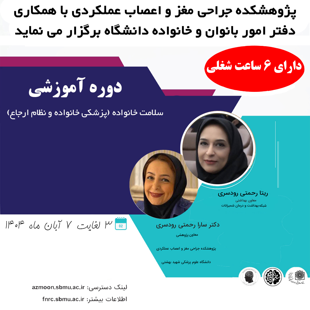 پژوهشکده و مرکز تحقیقات جراحی مغز و اعصاب عملکردی دانشگاه، دوره های آموزشی شغلی "سلامت خانواده (پزشکی خانواده و نظام ارجاع)" و "مدیریت درمان سکته حاد مغزی" را در آبان ماه برگزار می نماید. شایان ذکر است این دوره ها، در روزهای مذکور در سامانه آزمون های الکترونیکی دانشگاه به آدرس azmoon.sbmu.ac.ir در دسترس خواهد بود.